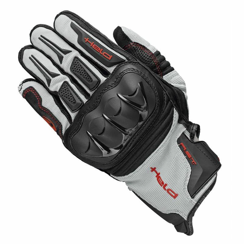 Guanto estivo Held con: – palmo in pelle di canguro con grip altamente resistente all’abrasione – dorso in materiale Spandex con finiture in pelle – colore permanente e a prova di sudore – sfoderato – manicotto con chiusura regolabile in velcro – speciale cucitura piatta – infradita traforato – areazione delle dita – base del pollice rinforzata con Superfabric – paranocche in plastica rigida